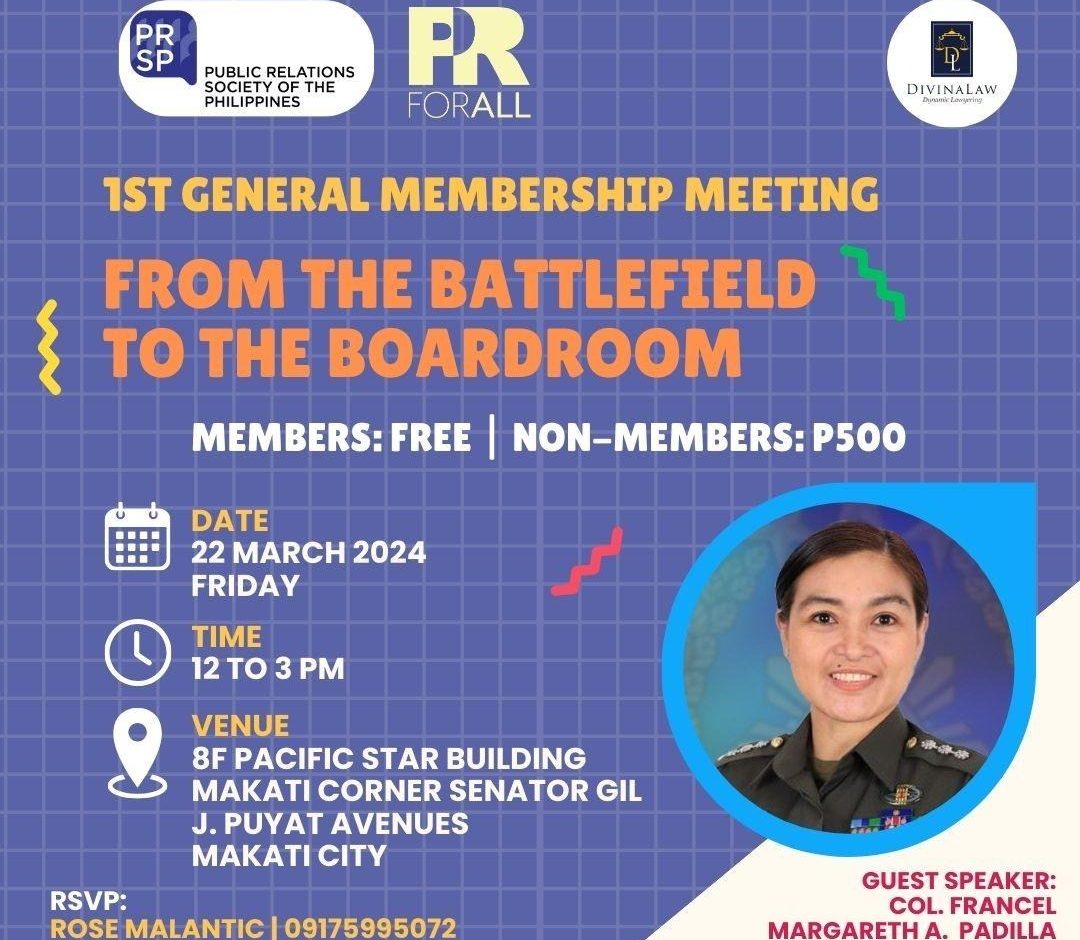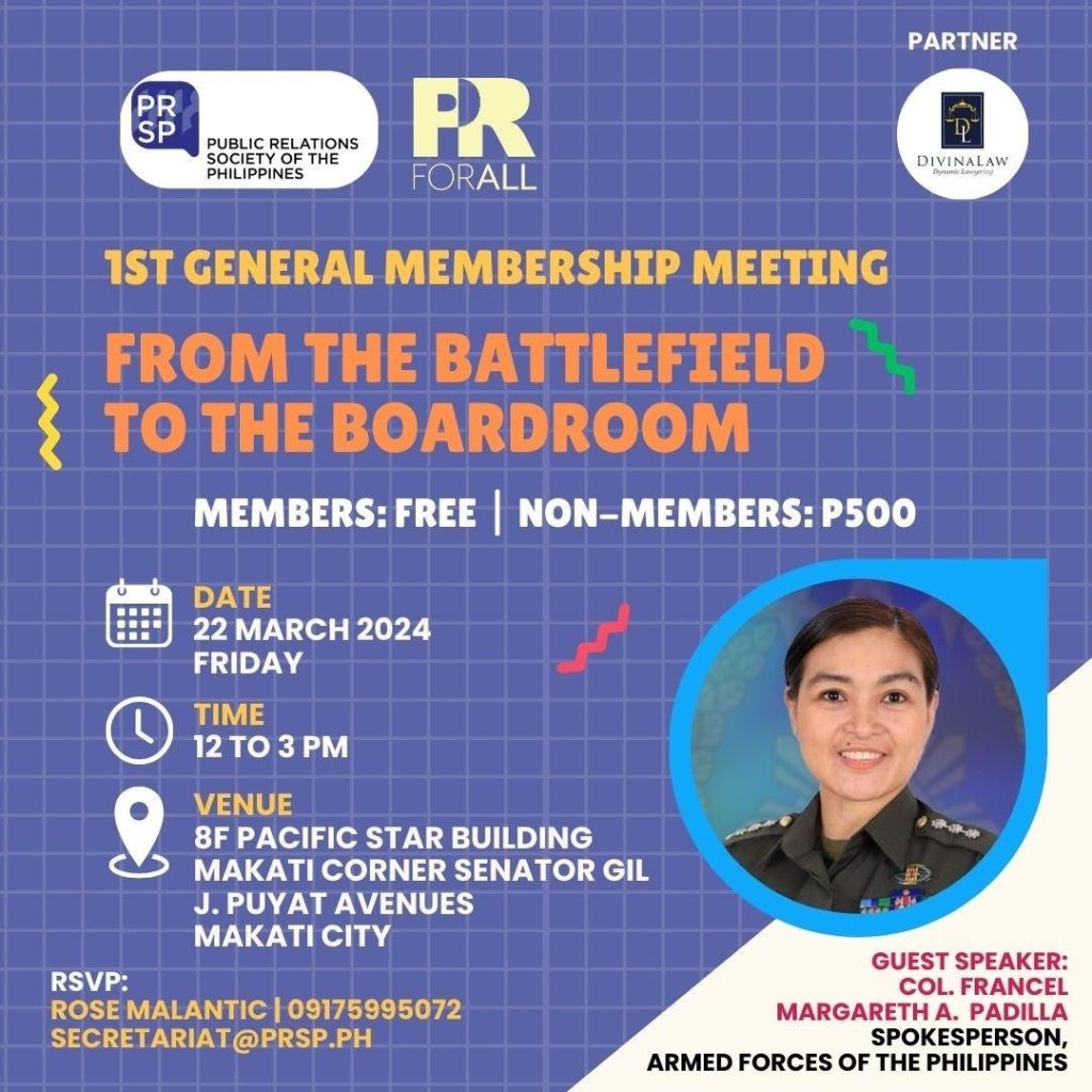 The Public Relations Society of the Philippines (PRSP) invites you to its 1st General Membership Meeting for the year to meet and network with PR practitioners from all industries on March 22, 2024 at Divina Law, 8th Floor Pacific Star Building, Makati corner Senator J. Puyat Avenues, Makati City (12-3PM).