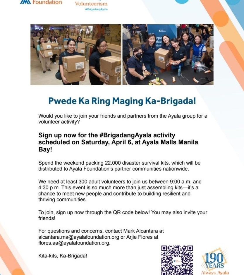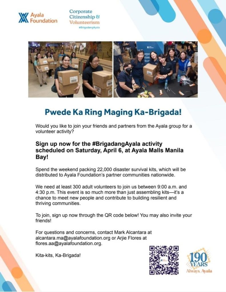Sign up now for the #BrigadangAyala activity scheduled on Saturday, April 6, at Ayala Malls Manila Bay!