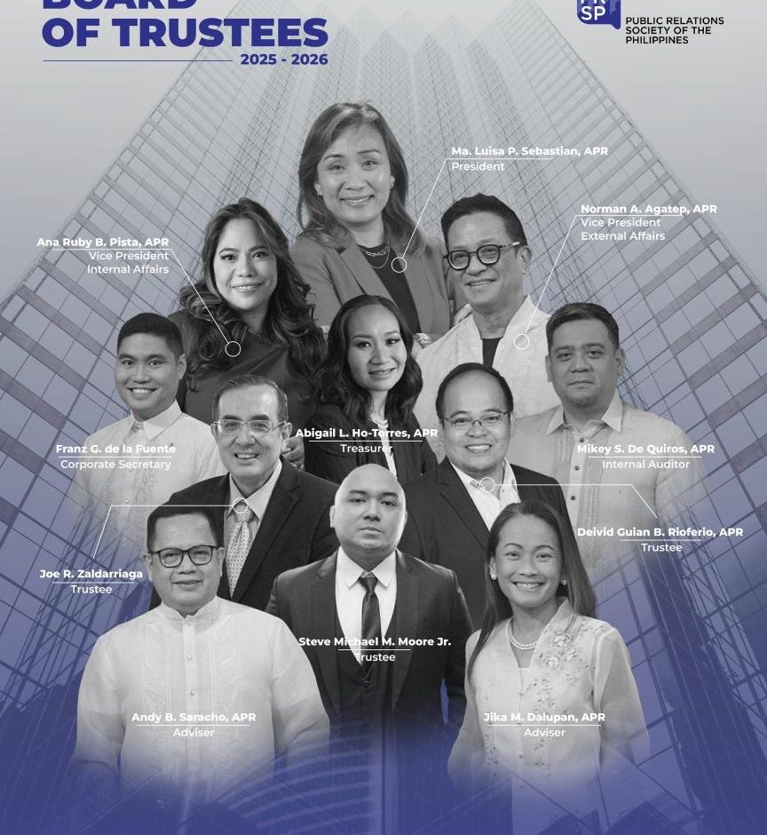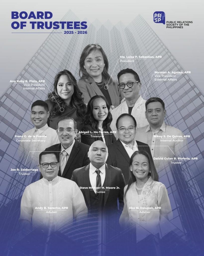 Join us in welcoming: Ma. Luisa P. Sebastian, APR (Brown Bag Communications), President; Ana B. Pista, APR (Ardent Communications), VP-Internal Affairs; Norman A. Agatep, APR (Grupo Agatep), VP-External Affairs; Abigail L. Ho-Torres, APR (Ikigai Philippines), Treasurer; Franz G. de la Fuente (Aboitiz Infracapital), Corporate Secretary; Paul Michael S. De Quiros, (Full Circle Communications, Inc.), Internal Auditor; Agapito Jose R. Zaldarriaga (MERALCO), Trustee; Steve Michael M. Moore Jr. (De La Salle-College of Saint Benilde), Trustee; and Deivid Guian B. Riofero, APR (TrustBridge Global Foundation), Trustee.